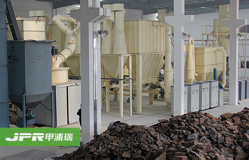 物料经颚式破碎机破碎后,由斗式提升机送至储料仓,通过电磁振动给料机把物料均匀连续地送到主机进行研磨,研磨后的粉末在鼓风机的作用下吹向选粉机进行分 选,分选后的细粉由管道送至储料仓,后经出料阀输出即为成品。整套生产线工作过程中气压为负,首先鼓风机吹出的空气伴随着细粉经管道进入储料仓上部的旋 风收集器内,由回风管道返回鼓风机,形成空气循环利用。其次,集粉器下端装有锁粉器,其作用是将外界正压气体与集粉器负压气体隔离开,大大提高了产量。再 次,主机底部残留的空气和粉尘通过管道被送到布袋除尘器进行过滤,粉尘等杂质被布袋除尘器吸附,有效地保护了环境。